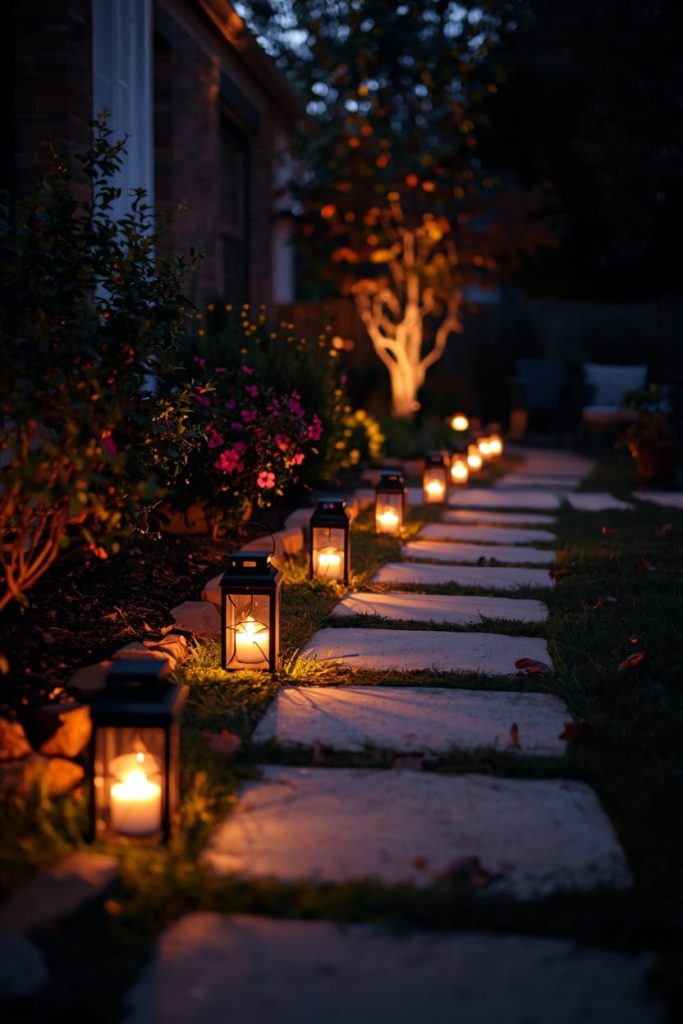 9. Lantern Pathway Glow (Backyard Patio Decor Ideas Aesthetic)