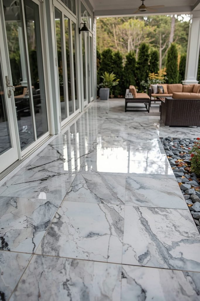 When I think about modern epoxy patio design ideas, the glossy marble effect is one of my favorites. It creates a high-end appearance that mimics natural stone while offering the durability of epoxy patio flooring. This look works beautifully for outdoor living spaces where elegance is a priority.