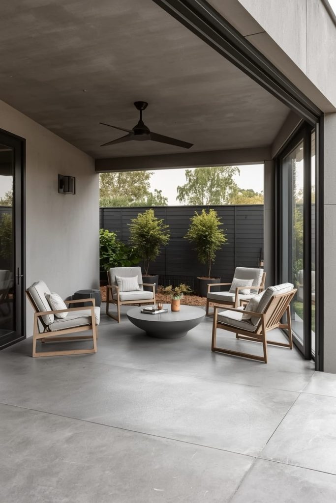 If you love clean and simple aesthetics, I highly recommend concrete-look epoxy patio floor ideas. This design gives your patio a smooth, industrial feel while maintaining a minimalist outdoor flooring style.