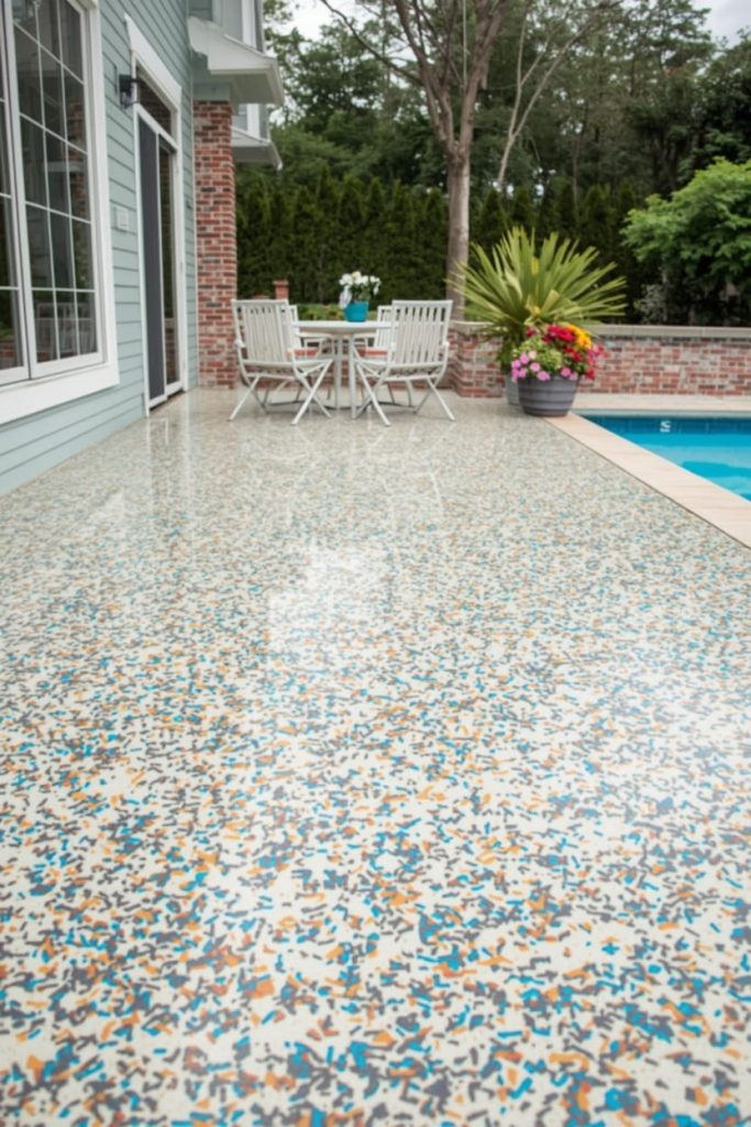 One of the most practical epoxy patio floor ideas is the flake finish. I often recommend this for homeowners who want both style and durability in their outdoor epoxy floor design. The decorative flakes add texture and visual interest while also improving slip resistance.