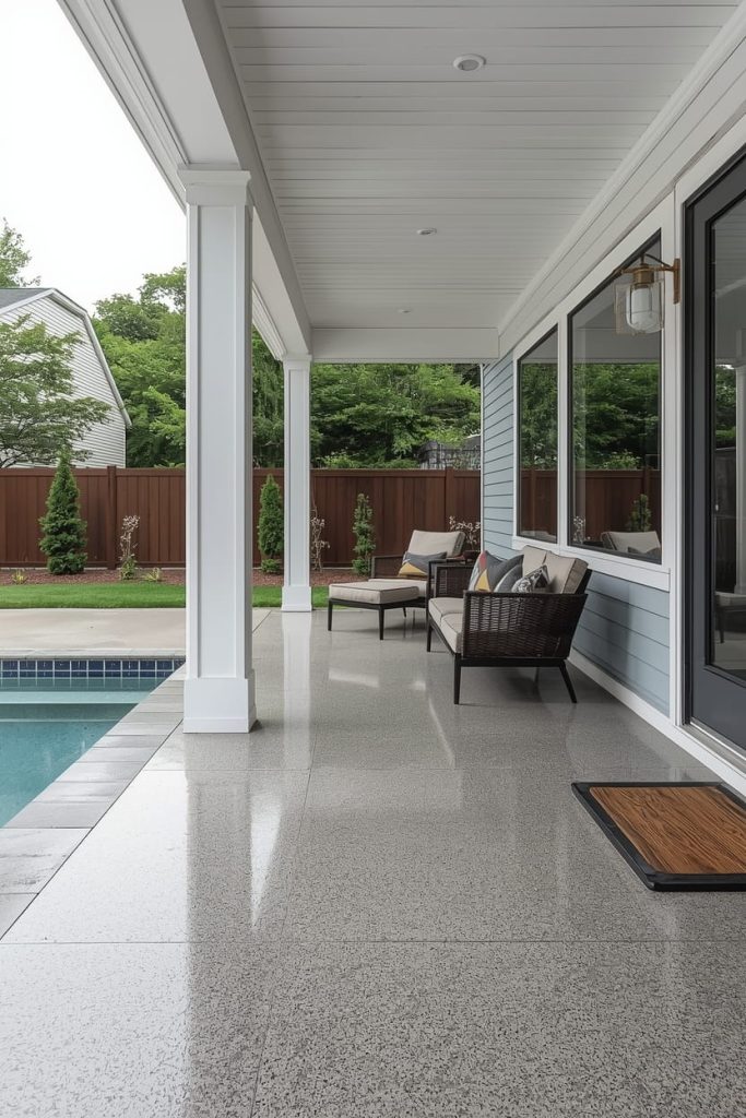 I’ve found that this type of epoxy coating works especially well in modern homes. It pairs beautifully with neutral furniture and creates a cohesive outdoor living space without overwhelming the senses.