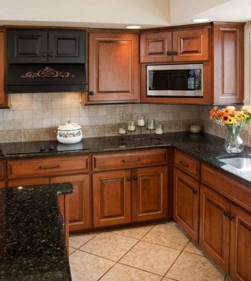 This pairing screams luxury kitchen with black granite and works beautifully in traditional kitchen cabinet colors.