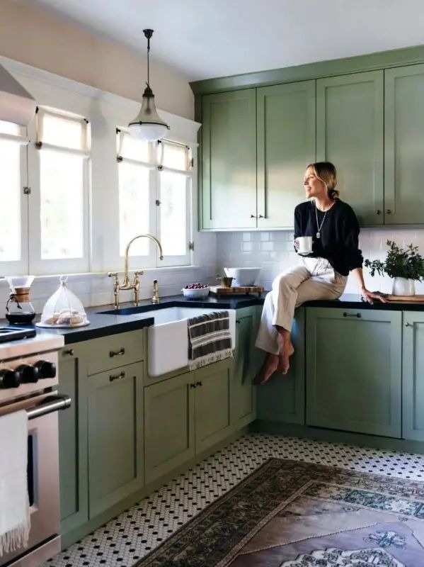 If you’re looking for cabinet paint colors for dark countertops that feel current but not trendy, sage is a safe yet stylish choice.