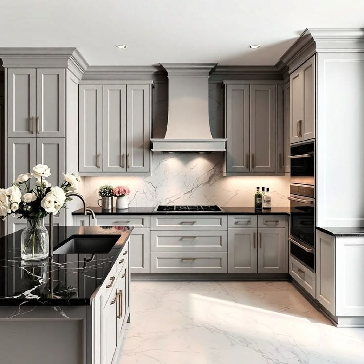 If white feels too stark, gray cabinets with dark granite are a stunning alternative.