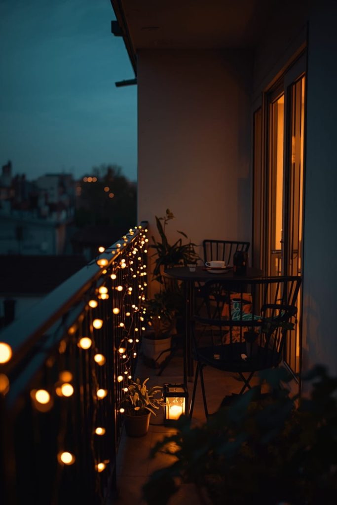 For a cozy, magical vibe, I drape apartment patio lighting ideas along the railing. It’s one of the simplest ways to make a small patio feel like a getaway.
