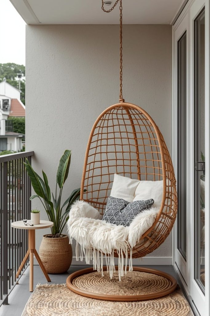 Hanging chairs are a whimsical addition to small apartment patio decorating ideas. They save floor space while creating a relaxing focal point.