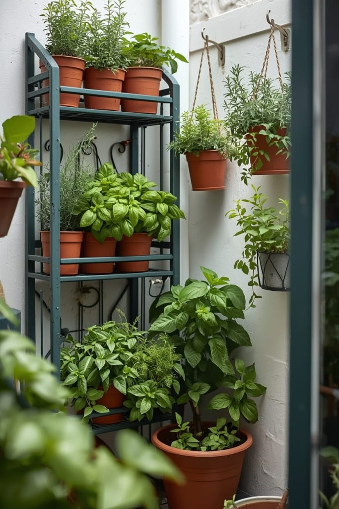 I used small pots on a shelf and attached a few hanging planters for vertical space efficiency. The scent and color make the patio feel vibrant.