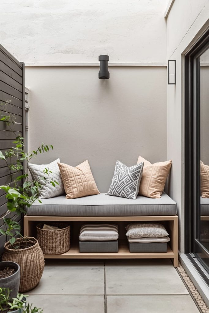 A compact storage bench is one of my favorite apartment patio decor ideas for renters. It provides seating while hiding cushions, gardening tools, or blankets.
