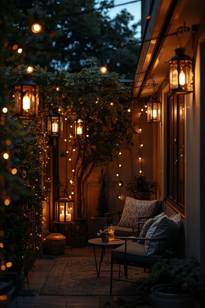 Lighting can completely transform a small apartment patio. I experimented with apartment patio lighting ideas using hanging lanterns and fairy lights, and the results were magical.