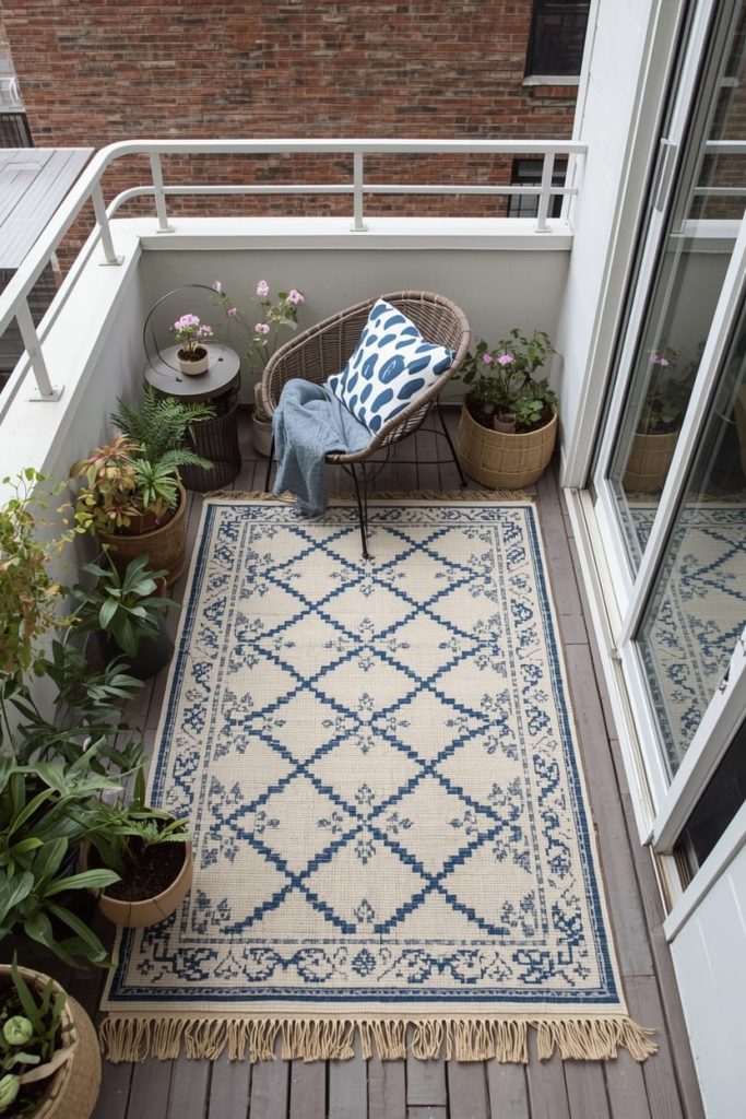 I found that small balcony patio ideas with rugs can completely change the feel of a space. Rugs anchor your furniture and create distinct zones for seating or dining.
