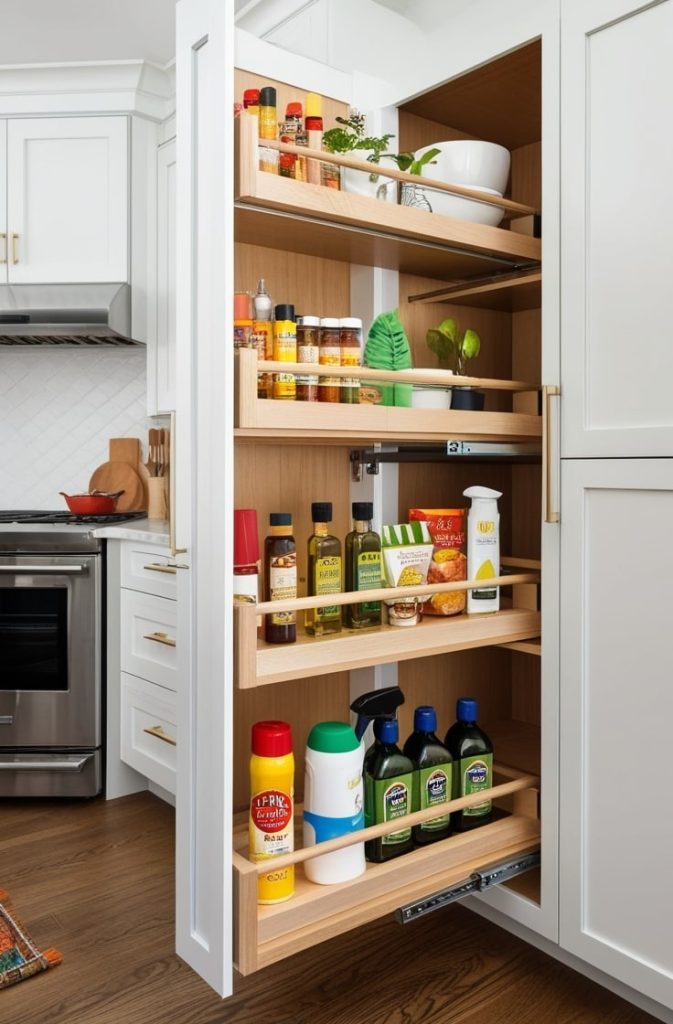 These are ideal smart cabinet solutions for small kitchens because nothing gets lost in the back. I often install pull out shelves for spices, oils, and cleaning supplies, especially in narrow kitchen cabinet ideas. They transform awkward spaces into usable storage while supporting compact kitchen cabinet ideas.