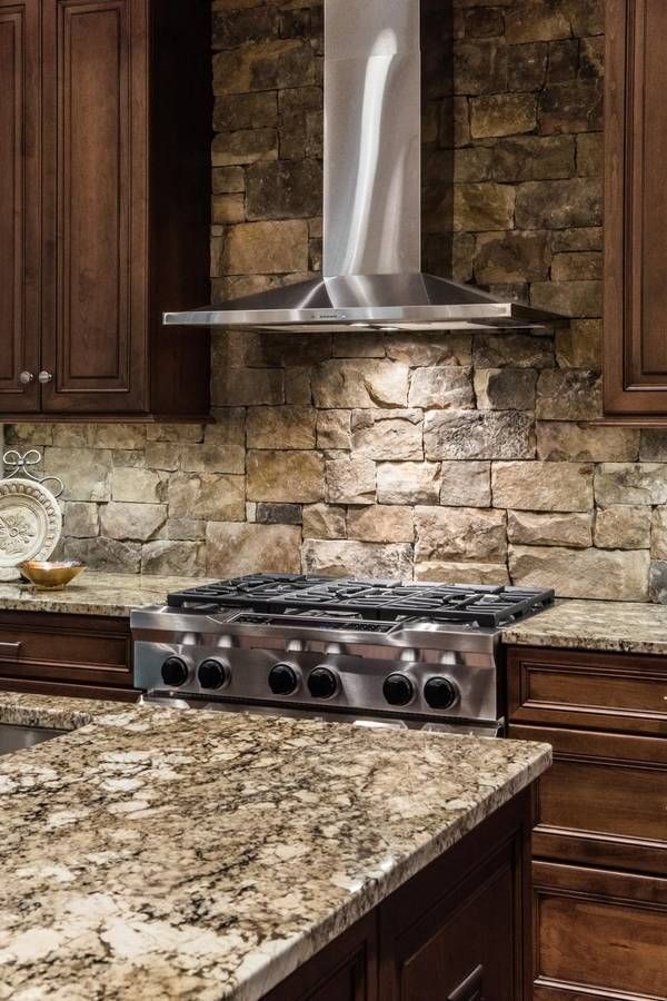 For farmhouse or rustic kitchens, I adore a natural stone stove backsplash.