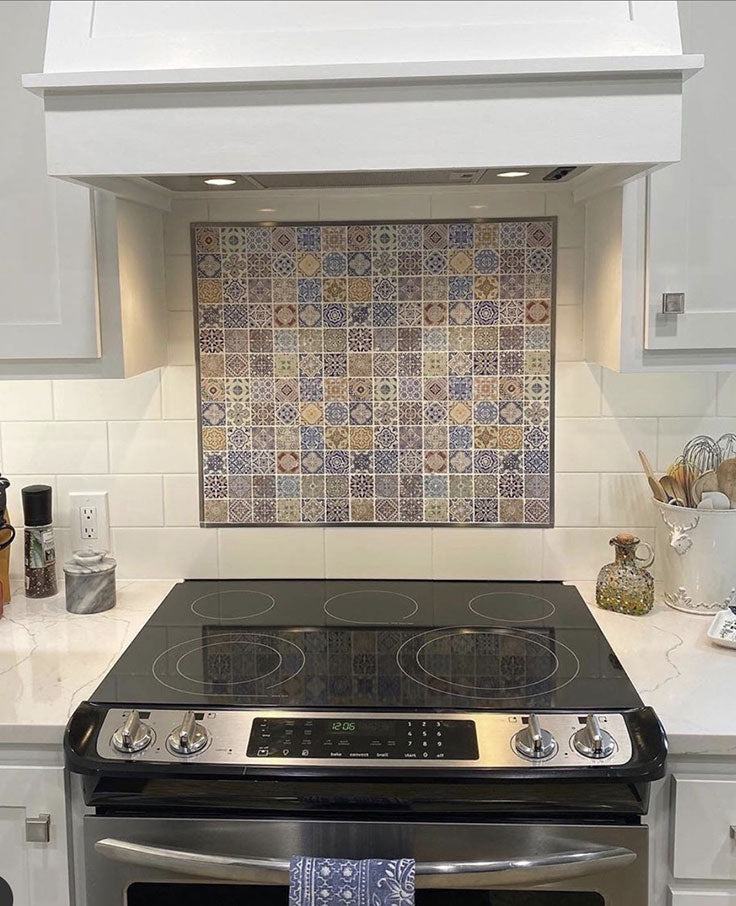 I love using encaustic-style designs as a framed panel behind the range.