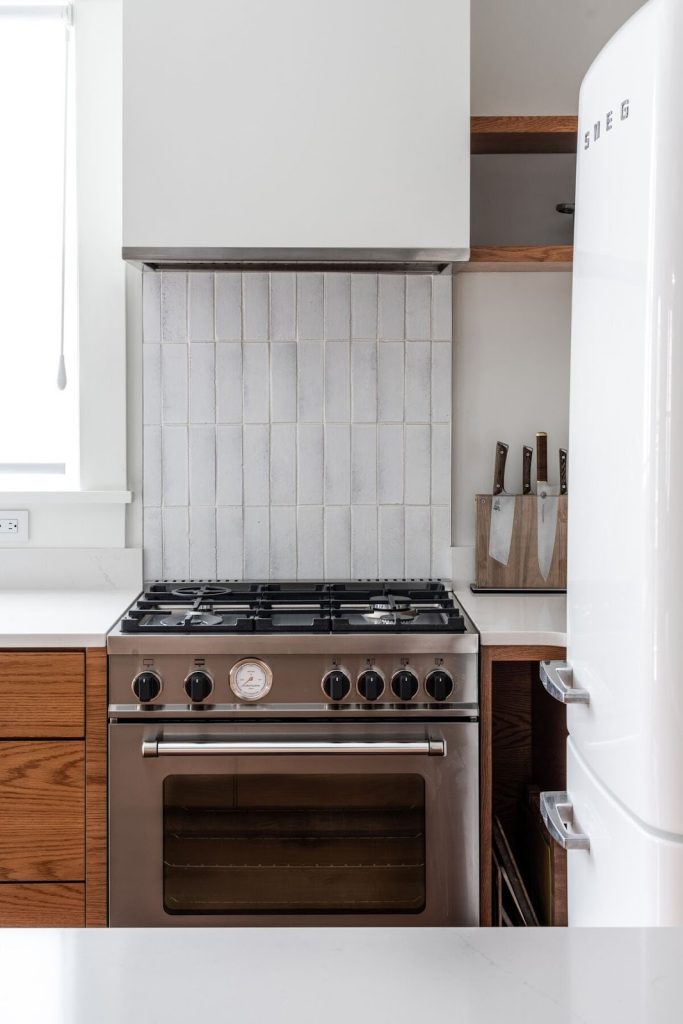 - A timeless subway tile stove backsplash