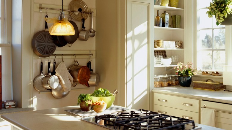 Hanging racks turn everyday cookware into part of the tiny kitchen decor.